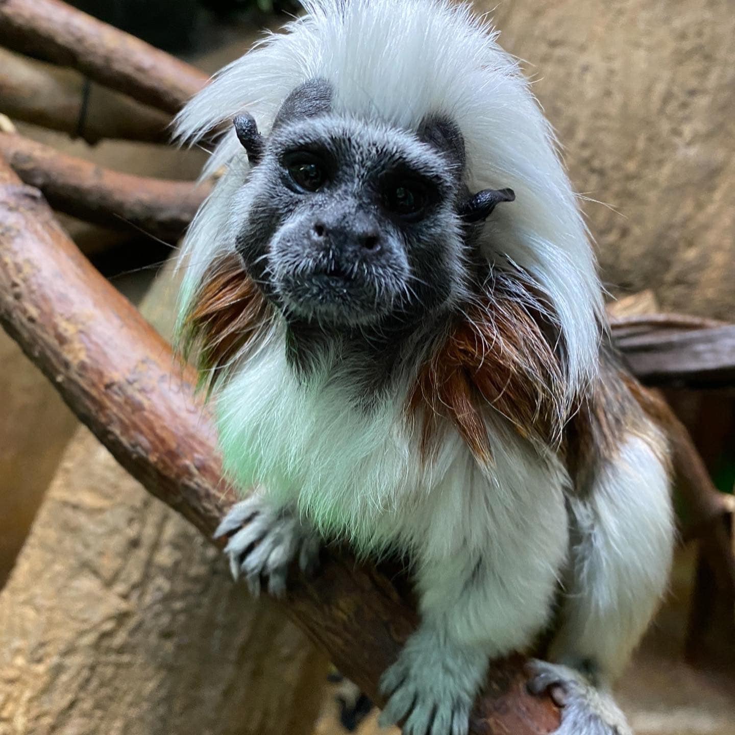 Cotton-top tamarins are critically endangered due to habitat destruction. They inhabit rainforests and woodlands, and are sensitive to any alteration of their habitat. The live in groups of up to 20 individuals, often comprised of a dominate mated pair and their offspring, which help raise the young.